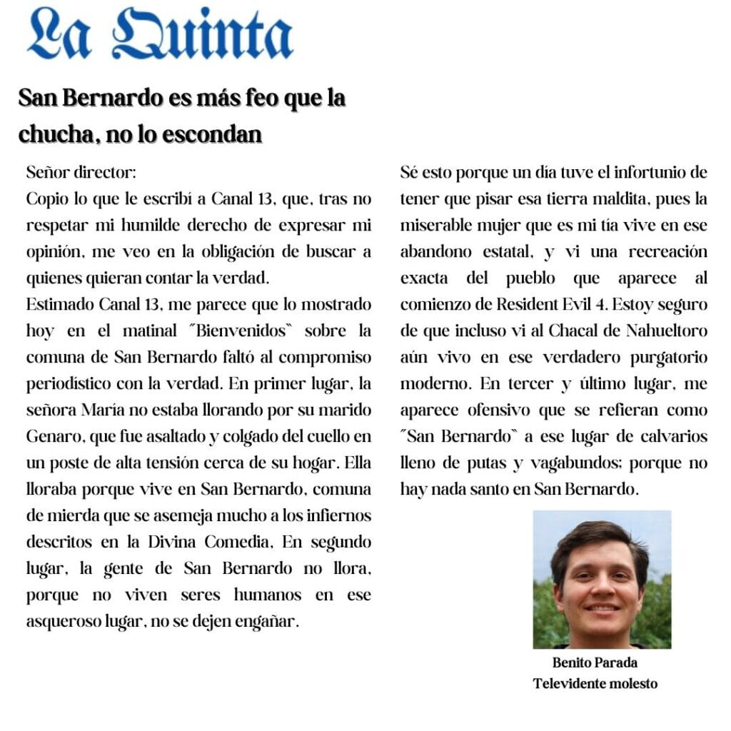 En segundo lugar, la gente de San Bernardo no llora, porque no viven seres humanos en ese asqueroso lugar, no se dejen engañar. Una vez fui a sacarme el servicio militar en ese intento de comuna, y vi una recreación exacta del pueblo que aparece al comienzo de Resident Evil 4. Estoy seguro de que incluso vi al Chacal de Nahueltoro aún vivo en ese verdadero purgatorio moderno.