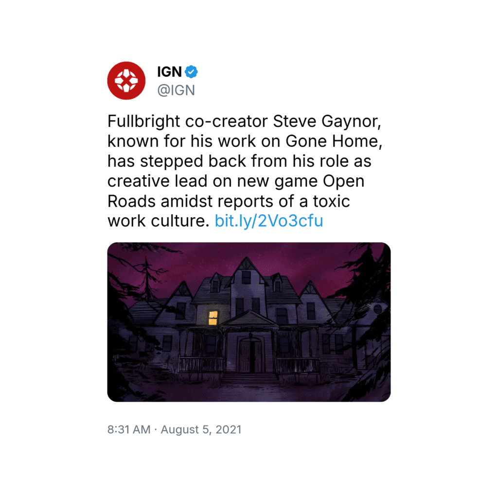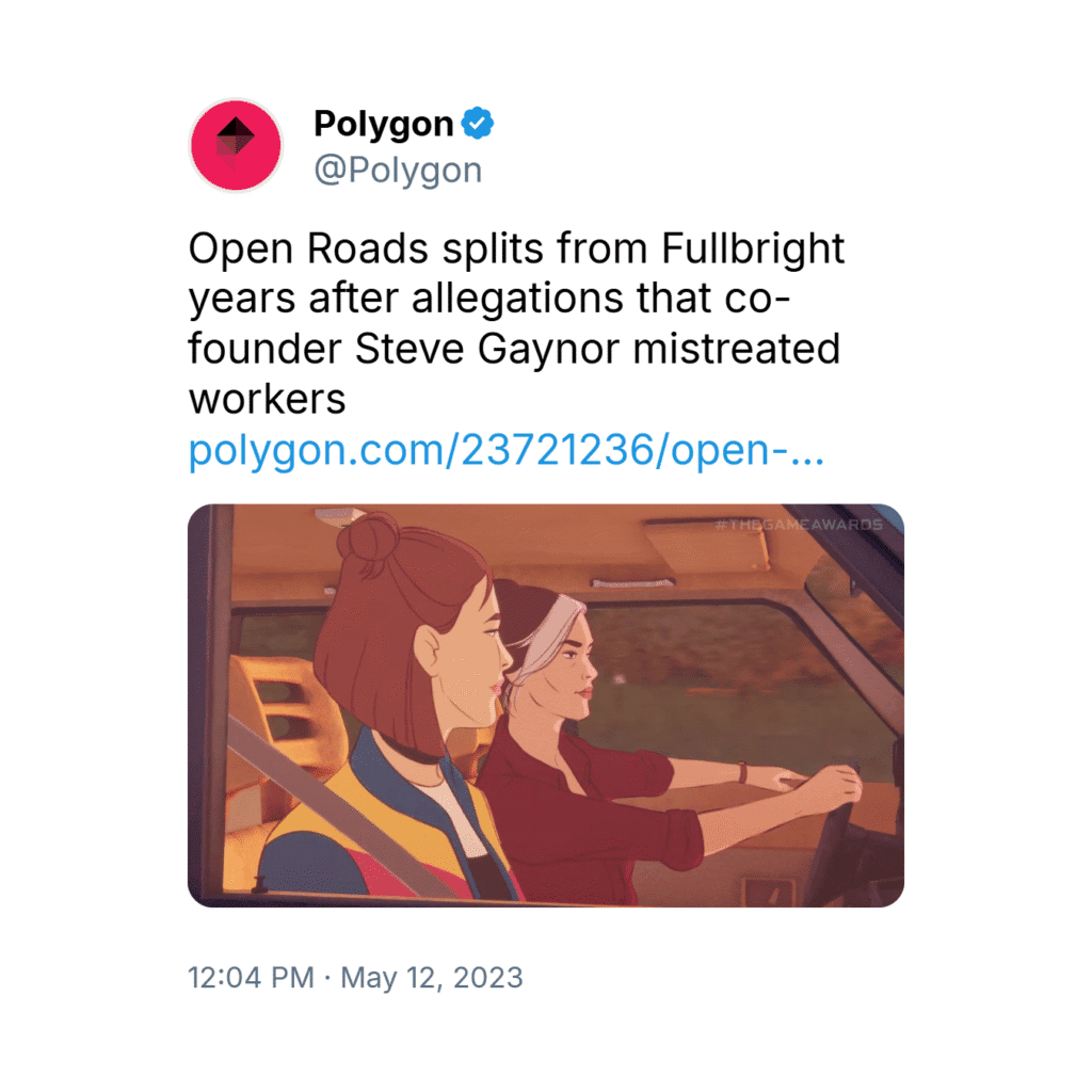 Lo último que me dijo la tía Yiya antes de volver a su miserable trabajo fue que, irónicamente, el cofundador de la compañía Fullbright, que en un principio desarrollaba este juego fue acusado de comportamiento tóxico por sus empleados. Debido a ello Open Roads tardó más de lo esperado en publicarse «¡más encima firmaron con otro nombre de compañía!».