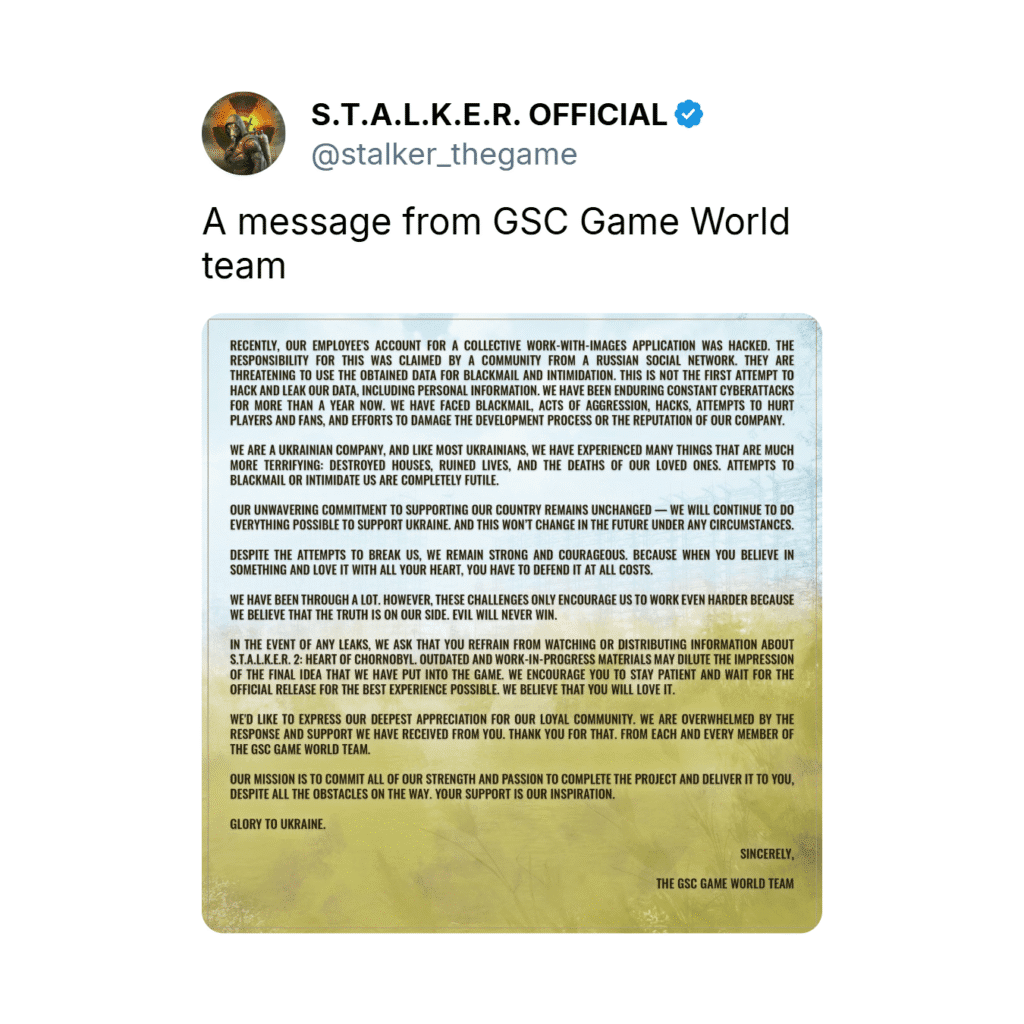 A medida que avanzó la guerra entre Rusia y Ucrania -iniciada a principios de 2022- el estudio a cargo de la ansiada secuela afirmó ser víctimas de diversos ataques cibernéticos por parte de usuarios rusos. Cabe recordar que los desarrolladores GSC Game World tenían su sede en Kiev, capital de Ucrania.