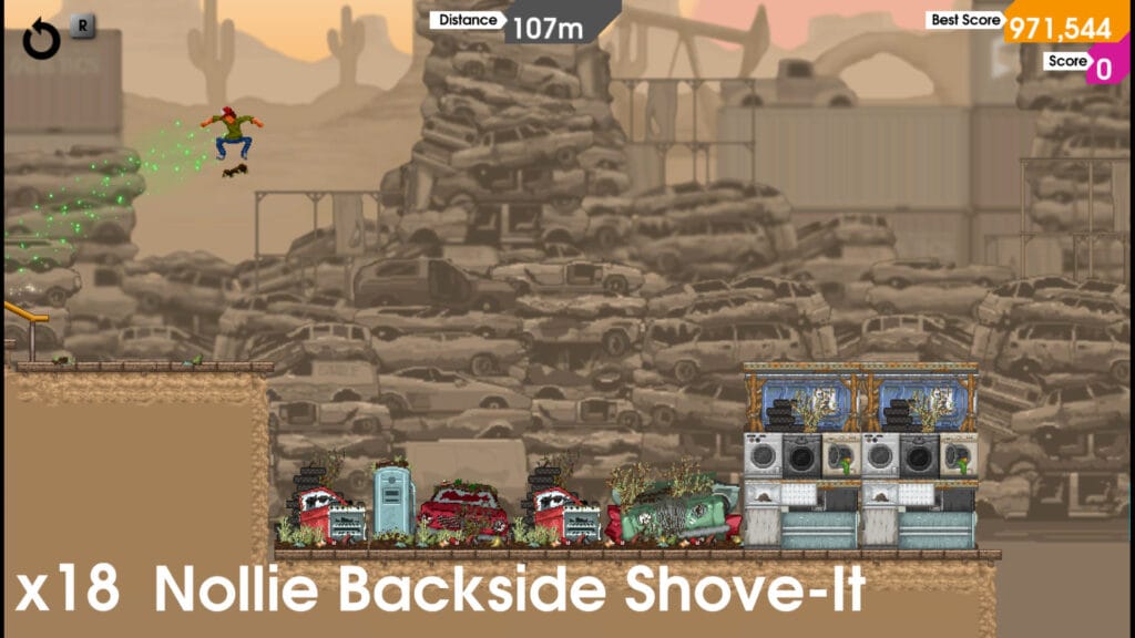 Para quienes hayan jugado alguna entrega de la saga Skate de EA, estarán más que familiarizados con la mecánica de “dibujar” los trucos en el joystick. Sin embargo, este pequeño juego le agrega un nuevo desafío: un botón específico para caer los trucos. Esto se vuelve un reto aún mayor, ya que la puntuación de las líneas que hagas en barandas, pisos, escaleras y más, podrá verse completamente arruinada si no logras un aterrizaje perfecto. Para esto, el timing es crucial, por lo que deberás estar siempre preocupado de él, ya que no solo se aplica a los trucos de piso sino que también a los deslizamientos. Es esta pequeña mecánica la que logra convertir los niveles en algo totalmente desafiante y adictivo.